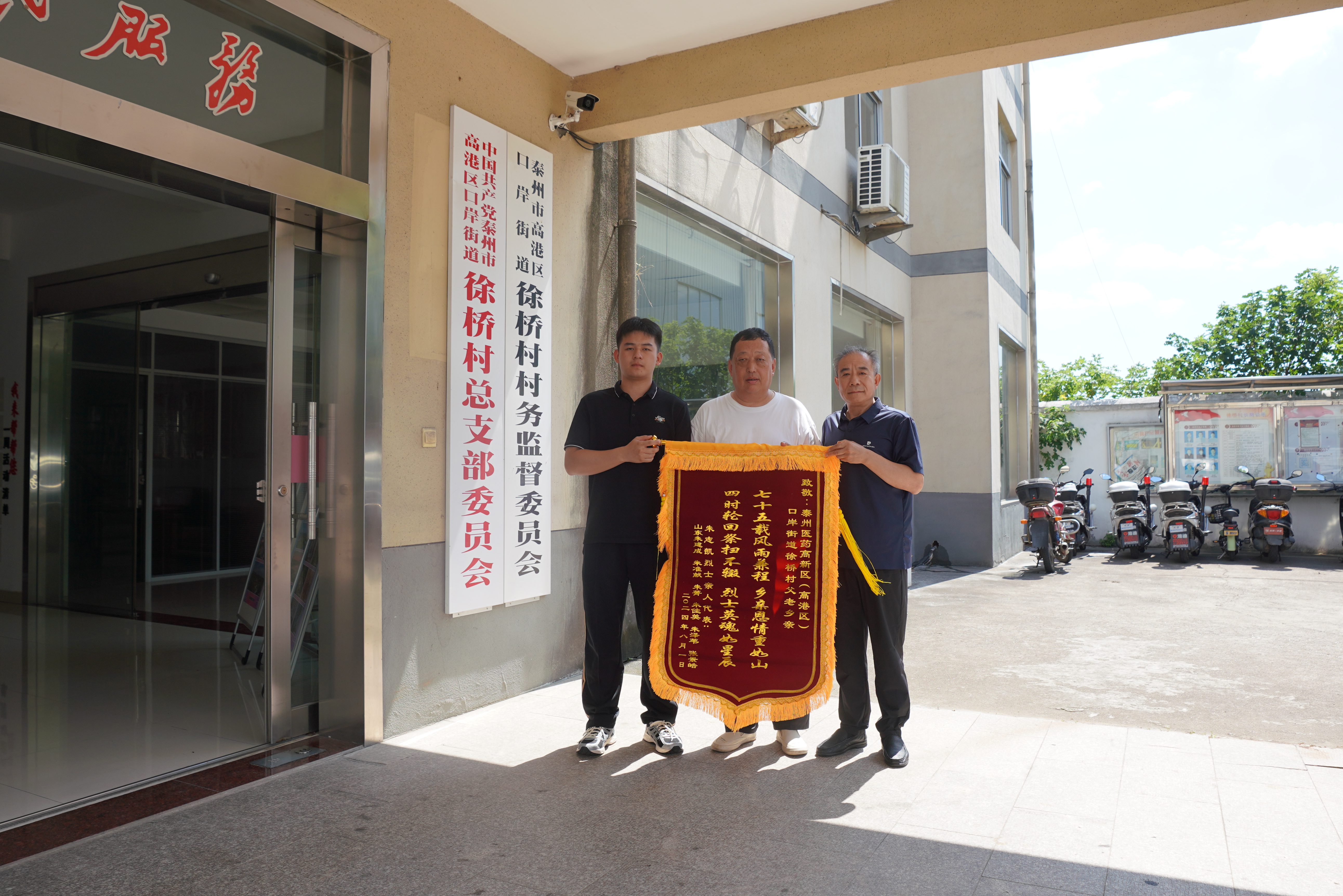 朱建成的随身行李里,除了全家人准备的祭扫物品,还有一面献给徐桥社区父老乡亲的锦旗:“七十五载风雨兼程 乡亲恩情重如山……”朱家人把最诚挚的谢意写在了绢面上。