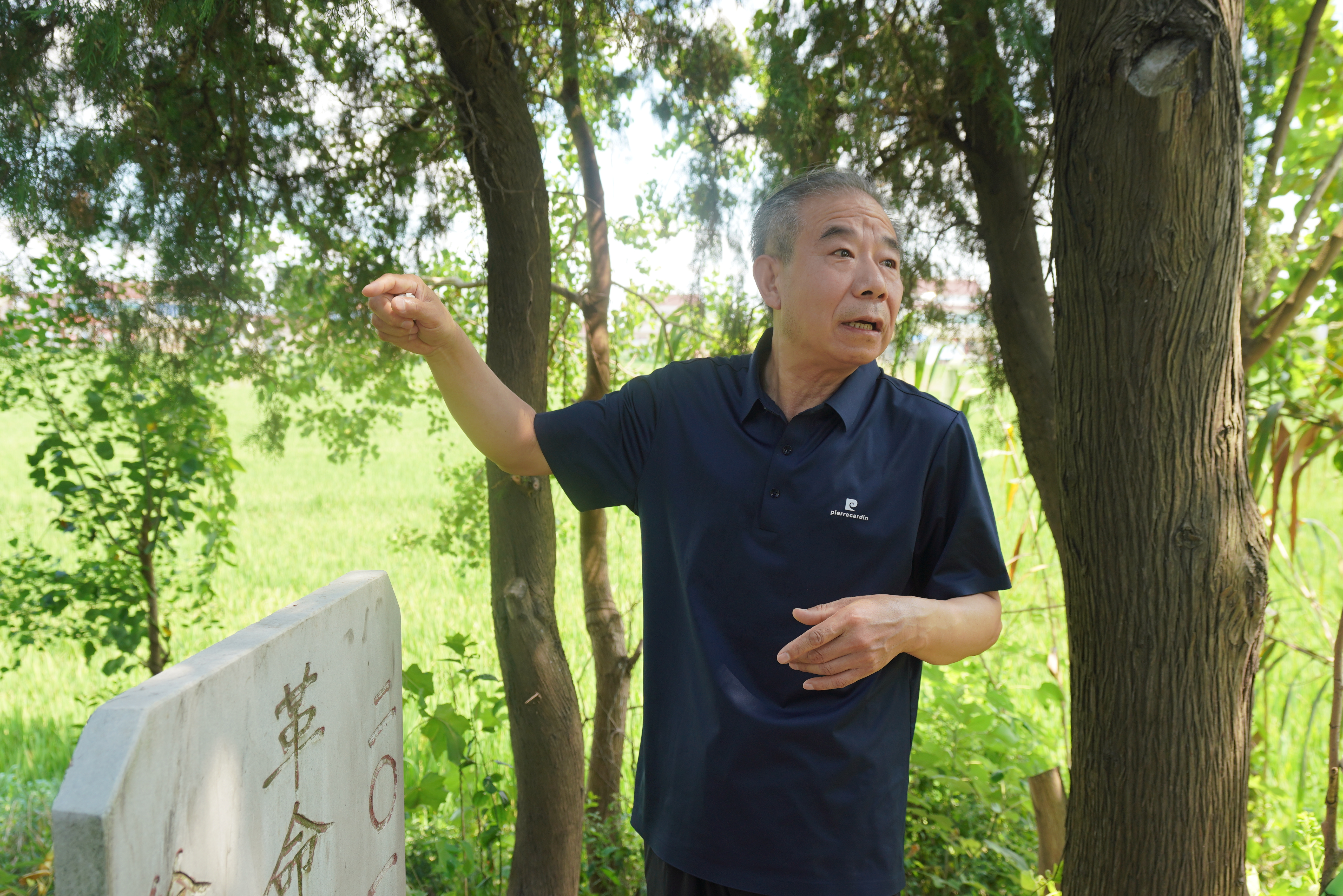 看到朱建成,村民们好像看到了从远方回来的亲人。室外温度超过了35℃,乡亲们把朱建成拉到阴凉处,你一言我一语地跟他讲:“每年清明、七月半、冬至,家家户户都给烈士扫墓,拔草、烧纸、添土。”“我们村守着墓75年了!”“我们都是先祭拜烈士,再去自家祖坟!”墓地坐落在江堤小高地上,路难行,“我们穿长筒雨鞋去,全村老小一个不落!”“周边小学每年也都组织师生去祭拜!”