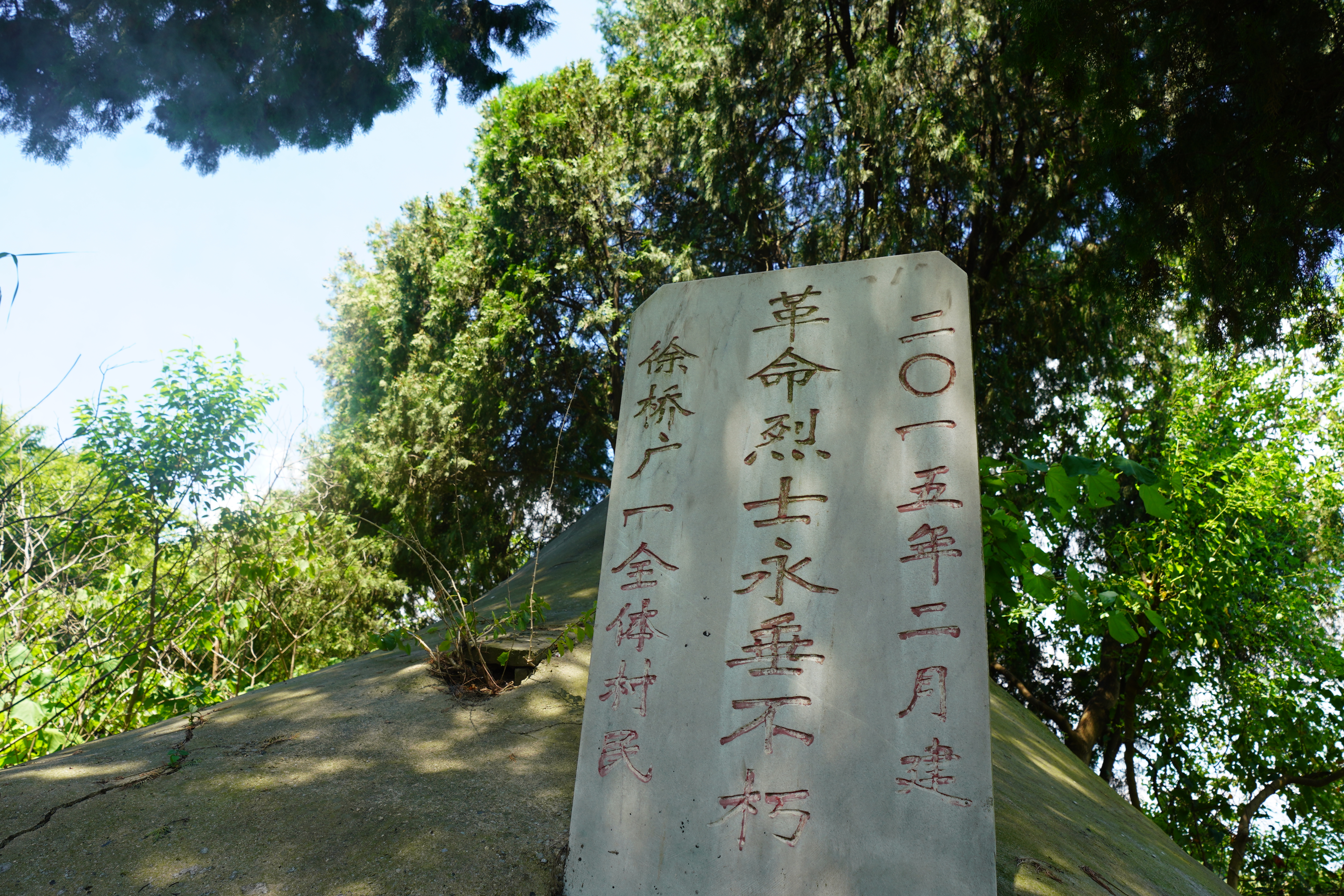 风吹雨淋,土墓不易维护。2015年,村民们挨家挨户捐款、找企业赞助,筹集了5000多元。有钱的出钱,有力的出力。合葬墓周围的一圈松柏,是老百姓亲手种下。原先的土墓用水泥浇筑加固,上面是村民手工刻着的一个小五角星,还铺了水泥路、水泥台阶。朱建成擦拭着墓旁的石碑,碑上刻字拙朴有力:“革命烈士永垂不朽 徐桥广一全体村民 二〇一五年二月建”。