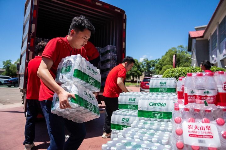 7月30日,在湖南湘潭县河口中学安置点,志愿者搬运生活物资。新华社记者 陈思汗 摄