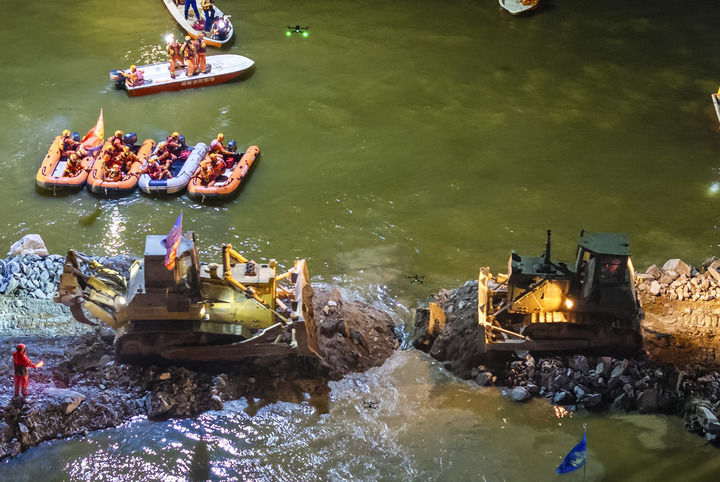 这是7月8日晚拍摄的团洲垸洞庭湖大堤决口封堵现场(无人机照片)。8日22时31分,团洲垸洞庭湖大堤决口完成封堵。新华社记者 陈思汗 摄