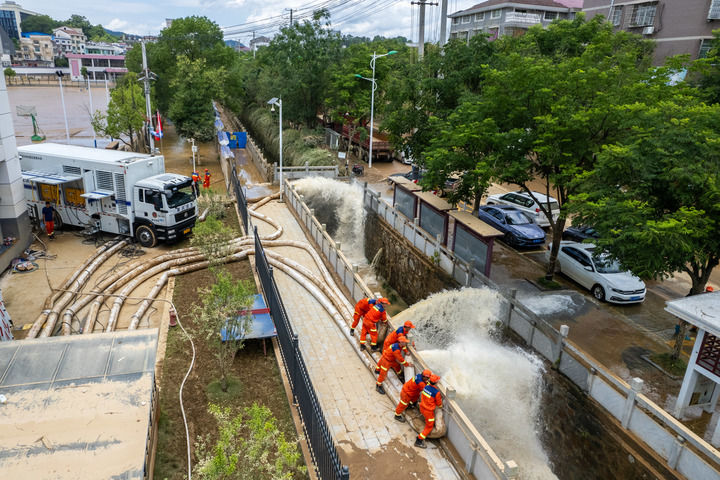 7月3日,在湖南省岳阳市平江县启明中学,国家矿山应急救援重庆队队员进行排涝工作(无人机照片)。新华社记者 陈思汗 摄