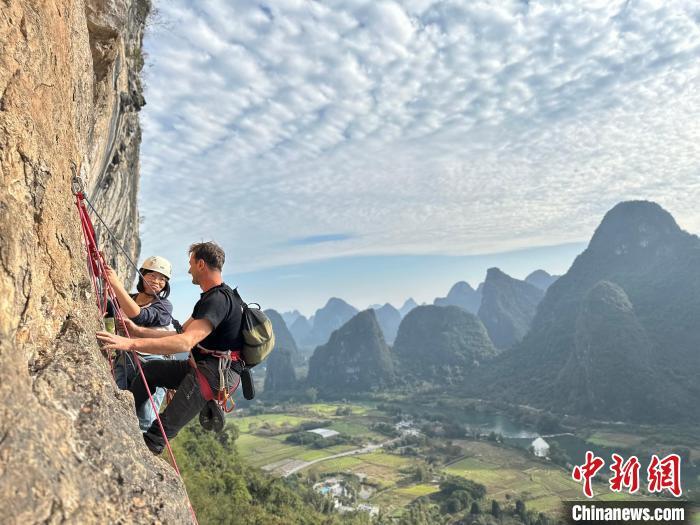 安祖(右)与妻子在阳朔进行攀岩运动。 (受访者供图)