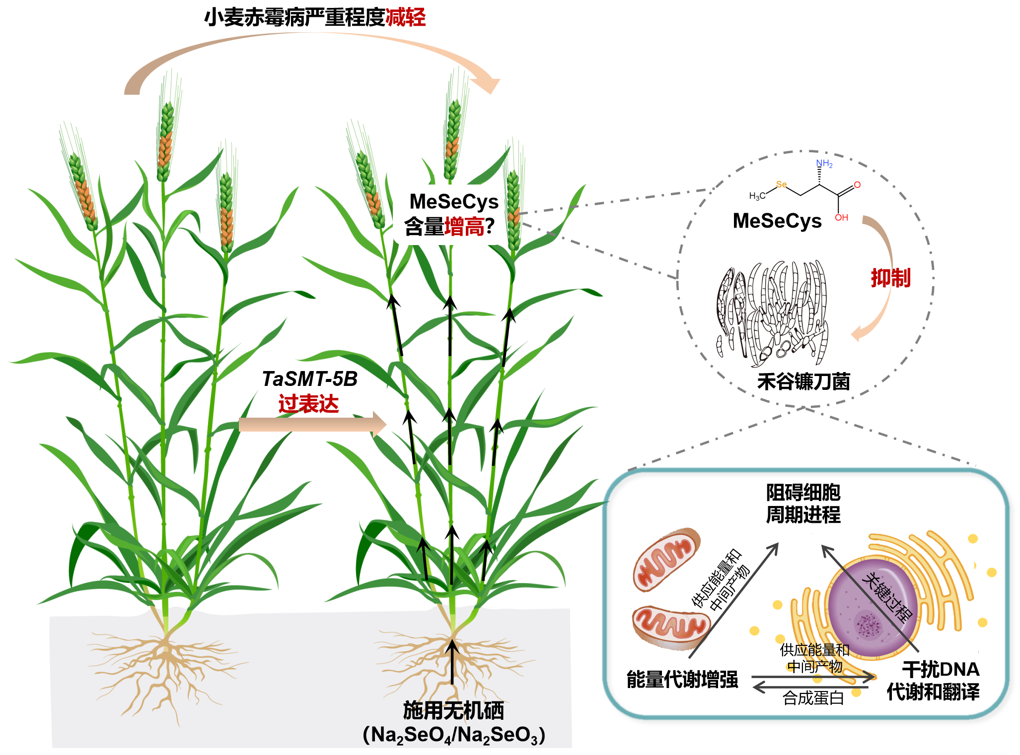 咸莉梅向记者解释该基因的潜在功能:“TaSMT催化形成的甲基代半胱氨酸可进一步生成挥发性气态硒,在气传病原真菌接触麦穗之前进行抑菌,从而降低植株感染率。此外,甲基代半胱氨酸在穗部和籽粒的积累也有利于抑制病原菌在小麦内部的扩散,并抑制毒素产生,理论上与小麦赤霉病抗性的四种类型全部相关。”