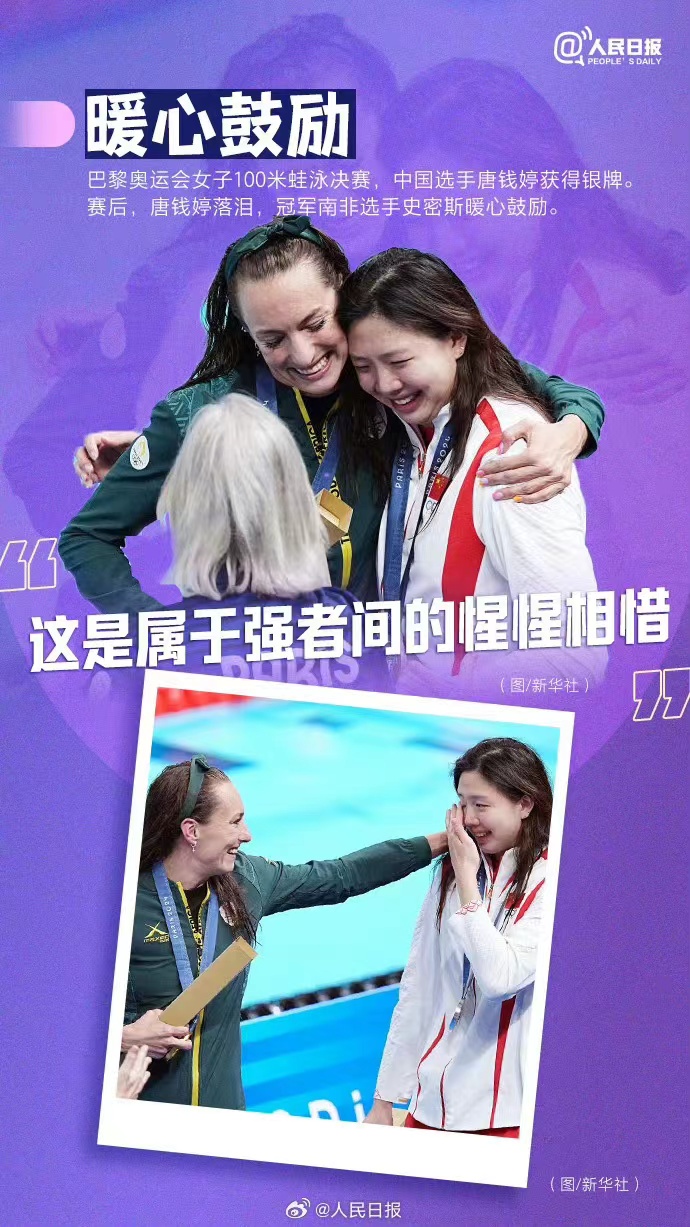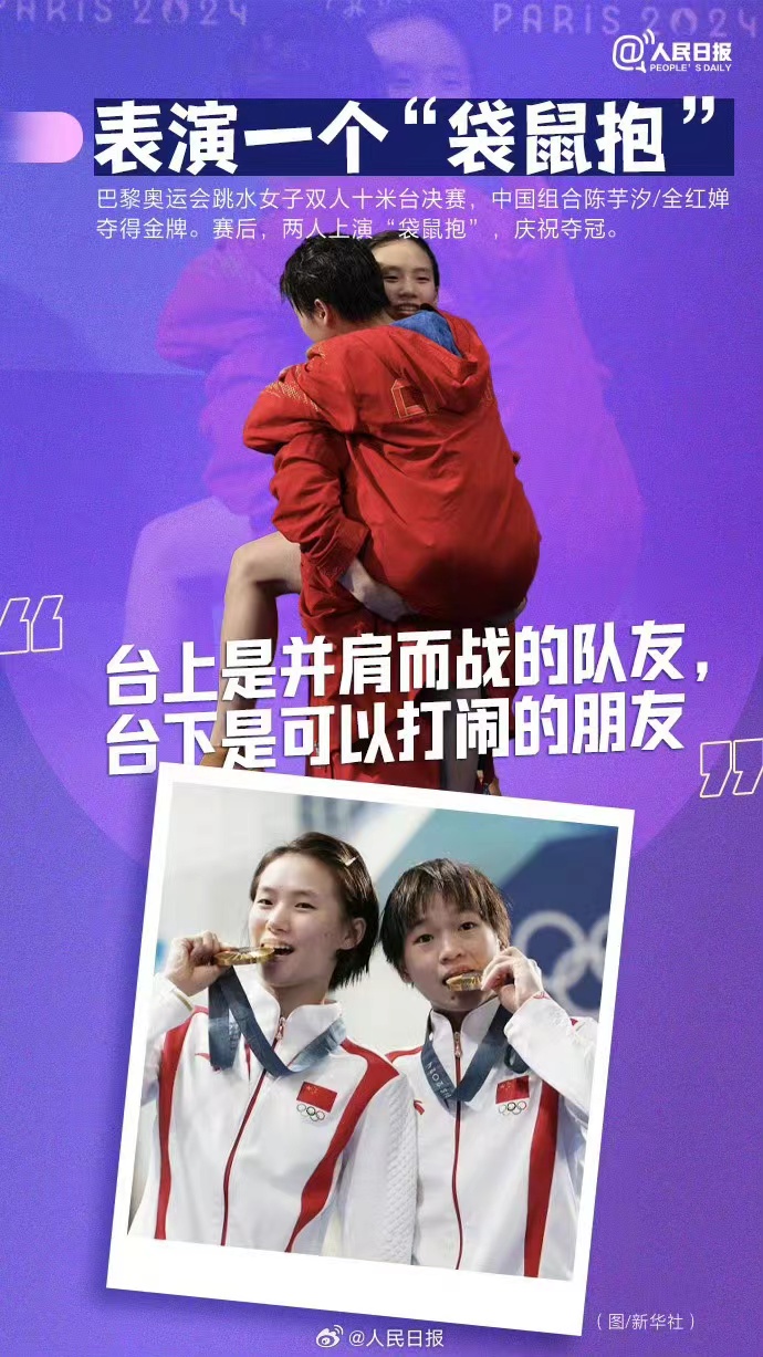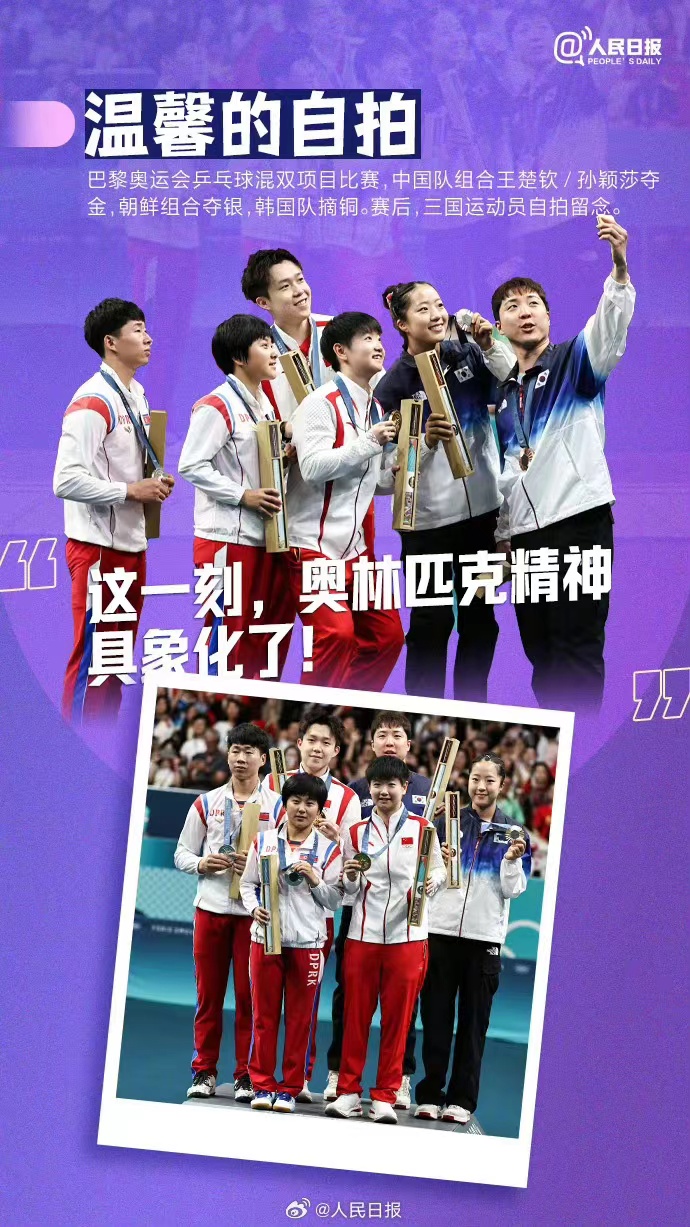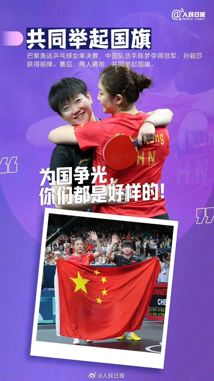 陈梦孙颖莎共同举起国旗;黄雅琼夺金后被求婚,收获一金一钻;陈芋汐全红婵夺金后上演“袋鼠抱”;中朝韩三国乒乓球运动员领奖台自拍……圆满、激动、团结,胜负之外这些奥运瞬间让人动容,谢谢你们带来的感动!(来源:人民日报微博)