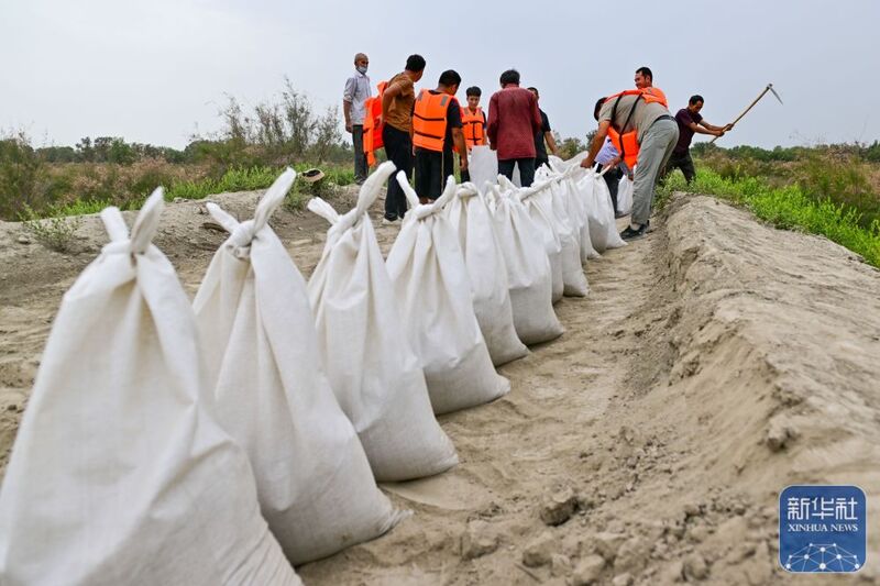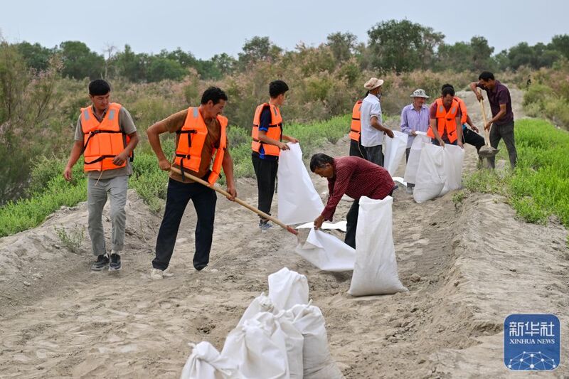 ↑在新疆阿克苏地区沙雅县盖孜库木乡一处河堤除险加固现场,抢险人员在装运沙袋(8月3日摄)。新华社记者 丁磊 摄