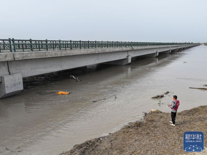 ↑在新疆阿克苏地区沙雅县盖孜库木乡,阿克苏水文勘测局的工作人员在盖孜库木大桥防洪段收集水文信息(8月3日摄)。新华社记者 丁磊 摄