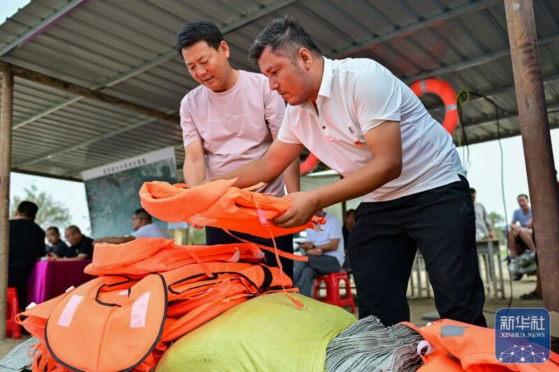 ↑在新疆阿克苏地区沙雅县盖孜库木乡吐央村,抢险人员在整理防汛物资(8月3日摄)。新华社记者 丁磊 摄