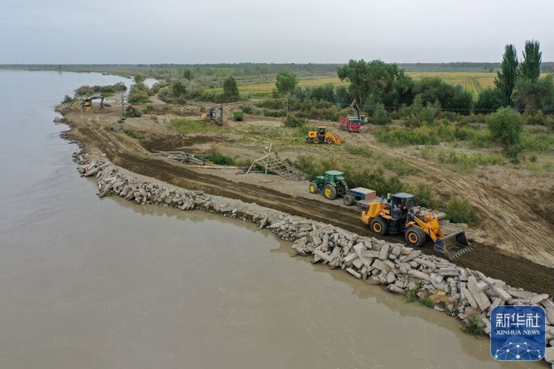 ↑在新疆阿克苏地区沙雅县盖孜库木乡吐央村,抢险人员驾驶大型机械进行堤坝加固(8月3日摄,无人机照片)。新华社记者 丁磊 摄