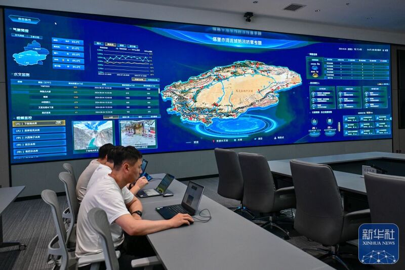 ↑在新疆塔里木河流域管理局,工作人员查看防汛实时数据(8月4日摄)。新华社记者 丁磊 摄