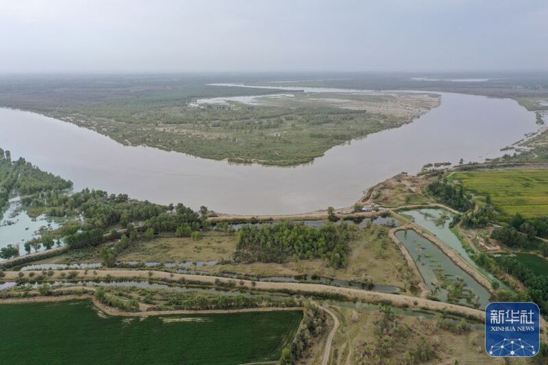 ↑这是在新疆阿克苏地区沙雅县拍摄的塔里木河。几字形的回水湾,距离最近的农田不足50米(8月3日摄,无人机照片)。新华社记者 丁磊 摄