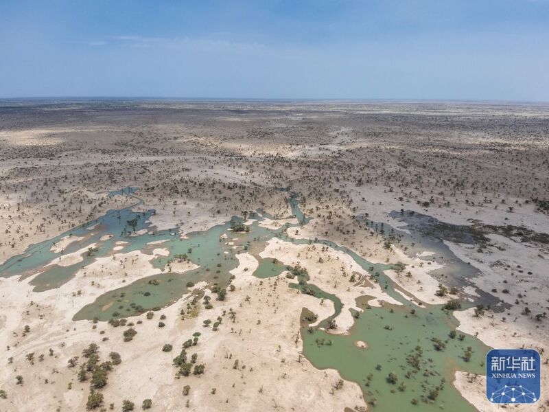 ↑8月1日拍摄的利用塔里木河洪水灌溉阿克苏地区沙雅县天然胡杨林的场景(无人机照片)。新华社发(强利民 摄)