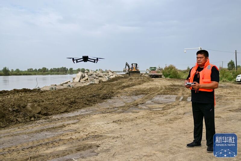 ↑在新疆阿克苏地区沙雅县盖孜库木乡吐央村,抢险人员利用无人机进行巡查(8月3日摄)。新华社记者 丁磊 摄