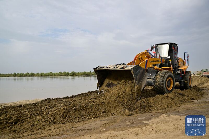↑在新疆阿克苏地区沙雅县盖孜库木乡吐央村,抢险人员驾驶大型机械进行堤坝加固(8月3日摄)。新华社记者 丁磊 摄