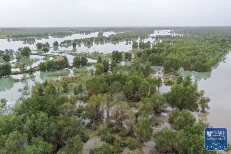 ↑8月3日拍摄的利用塔里木河洪水灌溉阿克苏地区沙雅县天然胡杨林的场景(无人机照片)。新华社记者 丁磊 摄