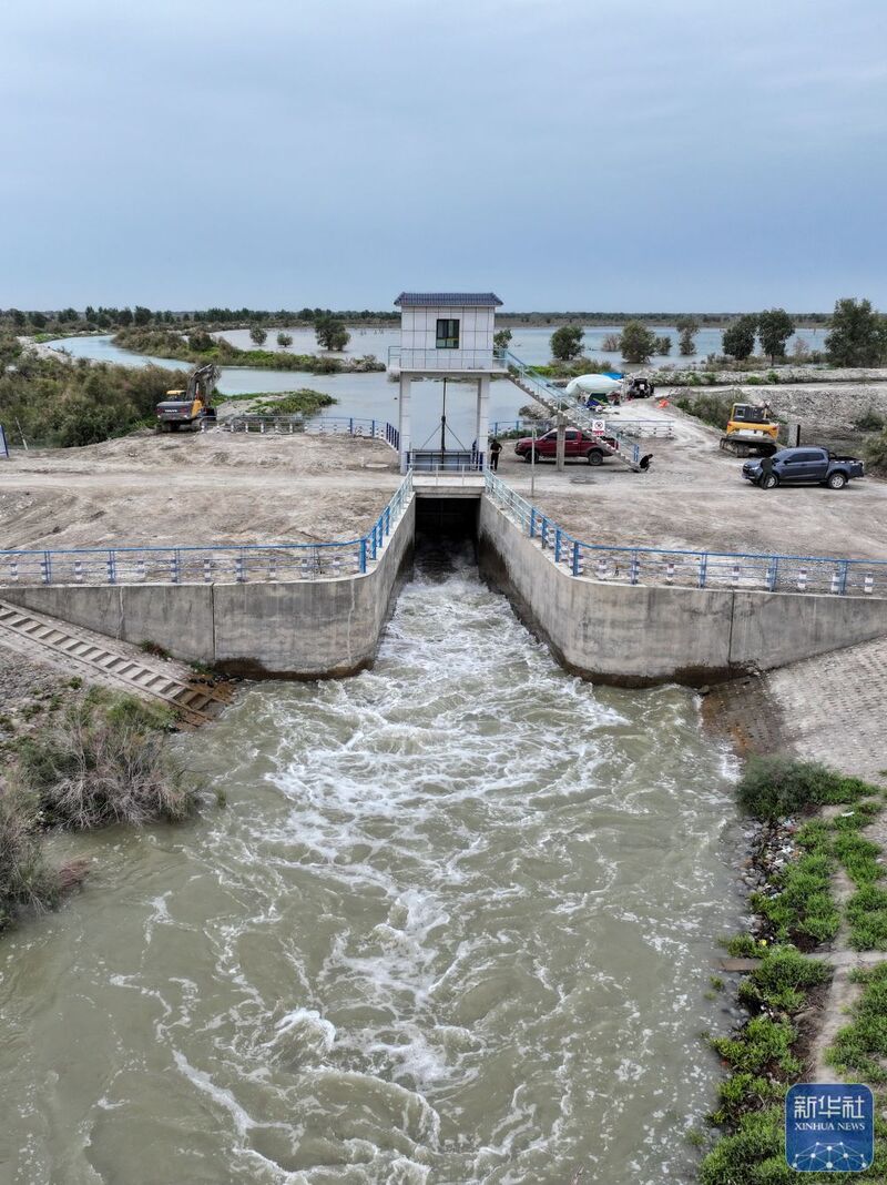 ↑在新疆阿克苏地区沙雅县盖孜库木乡,一处生态闸在进行引洪灌溉胡杨林(8月4日摄,无人机照片)。新华社发(刘华利 摄)