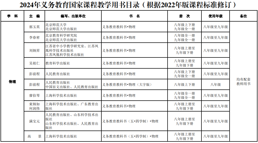 1、《2024年义务教育国家课程教学用书目录(根据2022年版课程标准修订)》中的外语类教材配有听力材料、体育与健康教材配有数字演示资源,各地秋季开学后可在国家中小学智慧教育平台(网址:https://basic.smartedu.cn)免费使用。