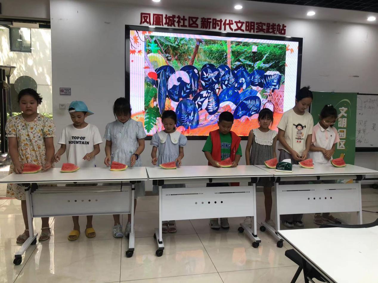 在南方有“立秋啃秋瓜”的习俗,在入秋的这一天多吃西瓜,以防秋燥,久之形成习俗。在活动中,进行了一场趣味吃西瓜比赛。小朋友们一个个摩拳擦掌,当红色管家志愿者准备好西瓜后,大家就铆足了劲,吃相各异,看比赛的观众更加激动,现场加油声、欢笑声此起彼伏,整个社区瞬间变成了一个欢乐的海洋。
