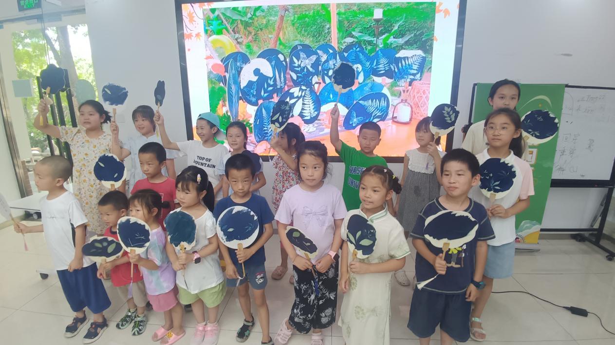 现场,志愿者老师还带领青少年们进行了植物蓝晒活动,将蓝晒液混合涂在扇面上,再把自己采摘的各种植物叶子、花朵等放在扇面上,晒了20分钟后,一把把古朴又有韵味的蓝晒扇子就完成了。