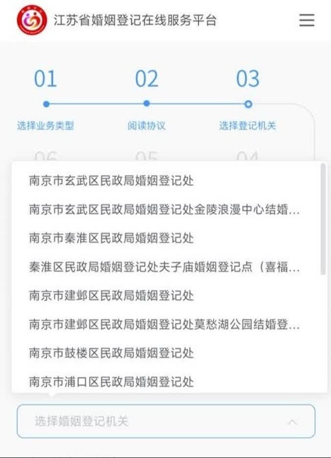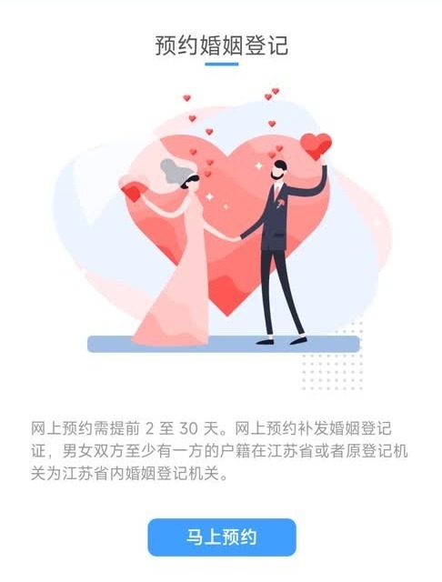 如何预约?请登录“苏服办”App,在首页搜索“婚姻登记预约”,选择开放预约的婚姻登记机关进行预约。或江苏省婚姻登记网上预约系统、“南京民政”微信公众号、南京市婚姻公共服务平台、“我的南京”手机App等。