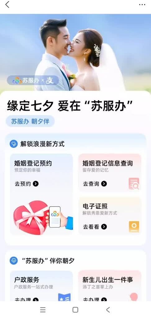 下载“苏服办”App或在支付宝首页搜索“苏服办”,进入小程序,在首页搜索“婚姻登记预约”,进入服务。