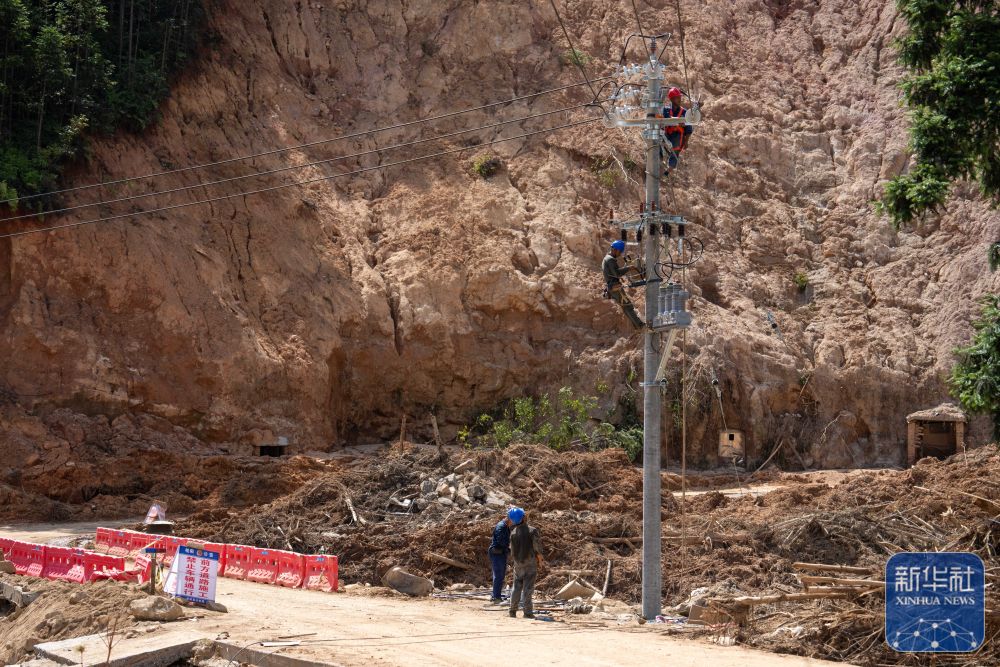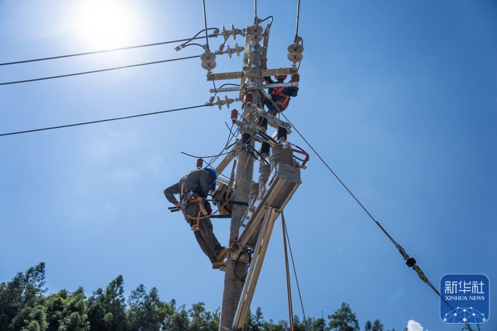 ↑8月7日,在资兴市州门司镇燕窝村,电力工人在抢修电力设施。新华社记者 陈思汗 摄