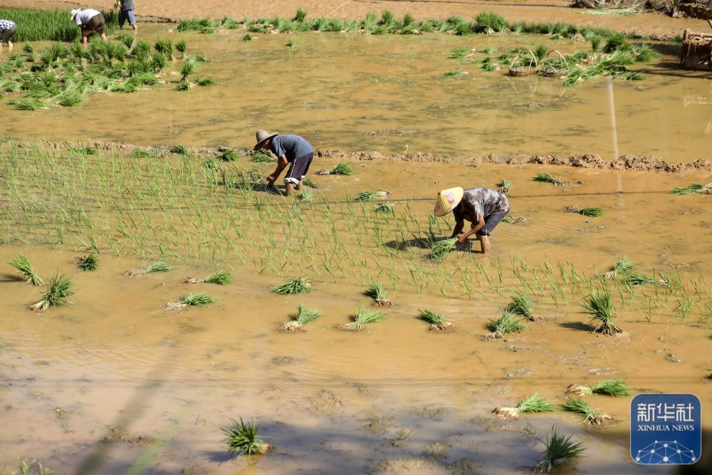 ↑8月7日,在资兴市兴宁镇,村民在抢插晚稻。新华社发(李科 摄)