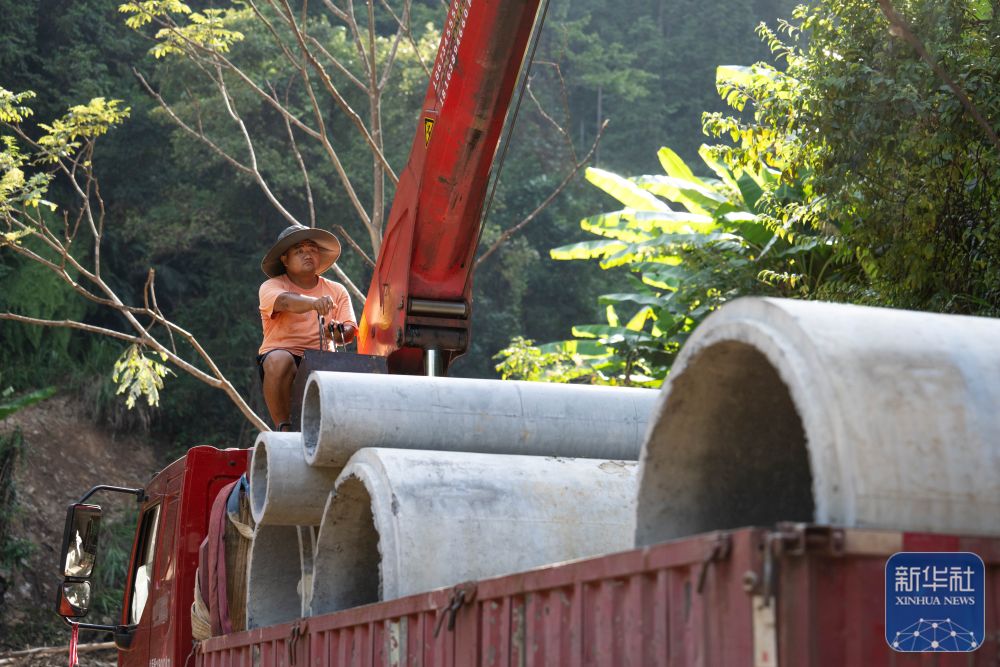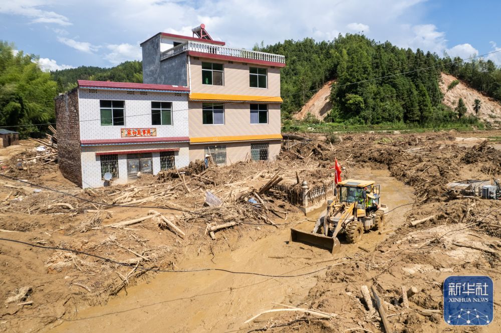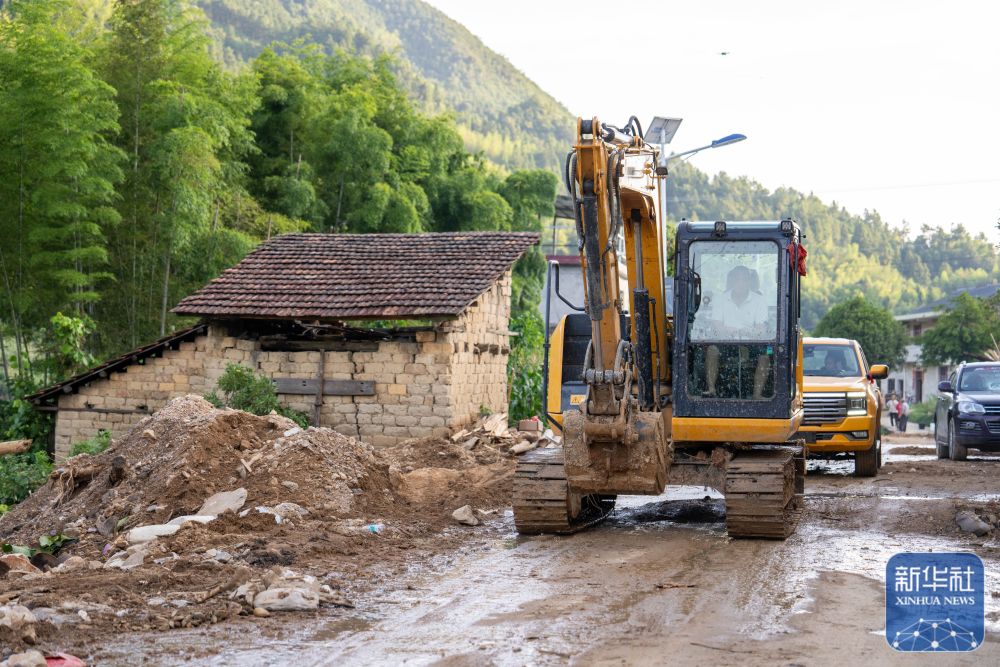 ↑8月7日,在资兴市白廊镇布田村,抢险队伍在抢修道路。新华社记者 陈思汗 摄