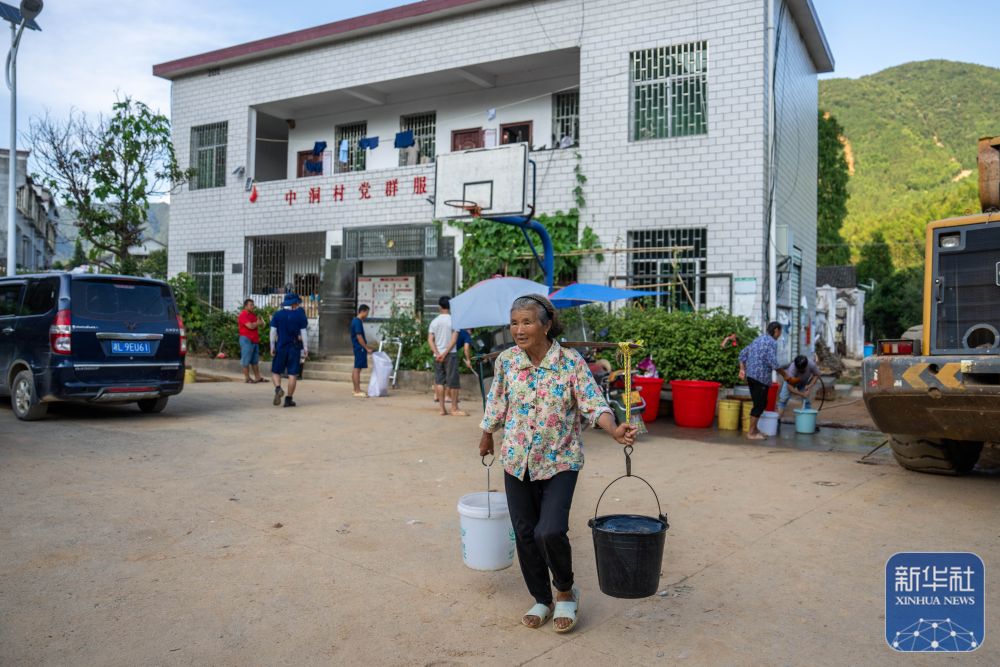 ↑8月7日,在资兴市白廊镇中洞村,村民在取水。新华社记者 陈思汗 摄