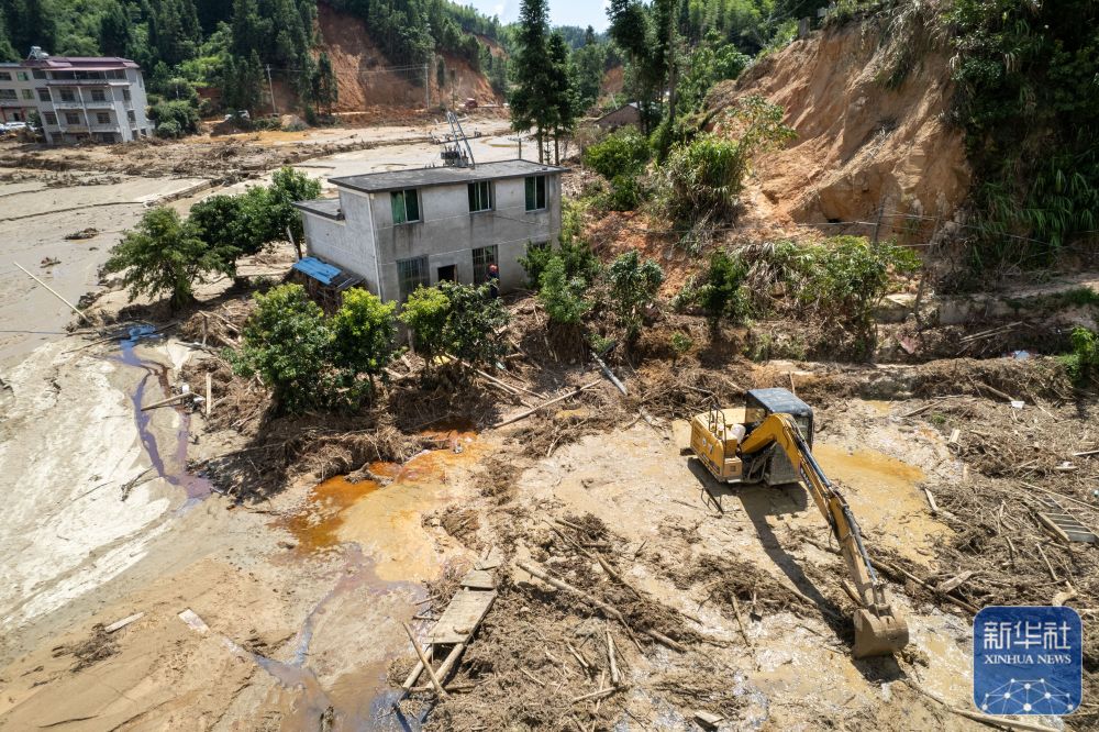 ↑8月7日,在资兴市州门司镇燕窝村,挖掘机在疏通河道(无人机照片)。新华社记者 陈思汗 摄