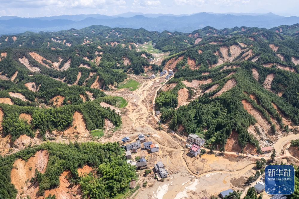 ↑这是8月7日在资兴市州门司镇燕窝村拍摄的受灾现场(无人机照片)。新华社记者 陈思汗 摄