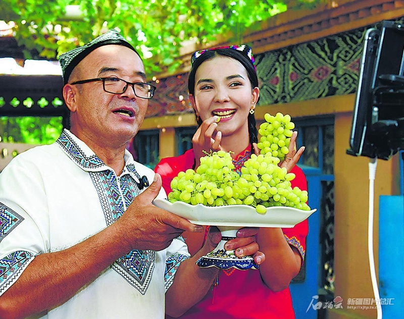 8月5日,网络主播在吐鲁番市葡萄沟景区直播销售葡萄。眼下,吐鲁番市63.28万亩葡萄陆续成熟,当地通过“线上+线下”方式将葡萄销往全国各地,目前鲜食葡萄销量已达20万吨以上。刘健摄