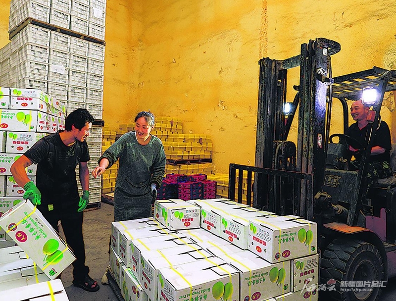 8月7日,阿克苏市天脉果业公司员工在冷链物流基地装运水果。该公司已形成集果品收购、冷藏、包装、销售、运输于一体的产业链,产品销往全国各地。杨硕摄