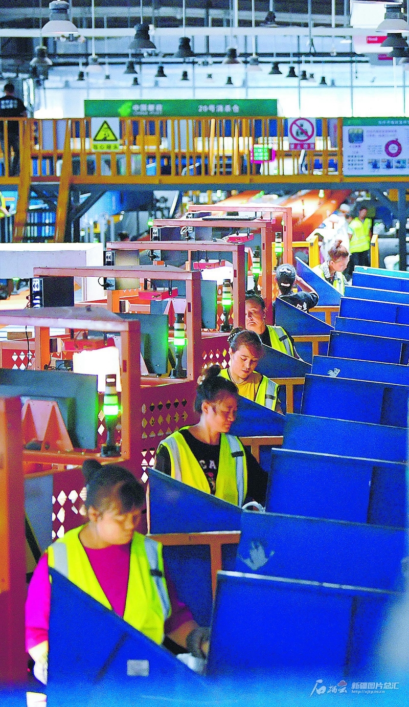 8月6日,中国邮政集团有限公司乌鲁木齐邮区中心工作人员通过智能设备分拣快递包裹。今年上半年,该中心快递业务处理量达7055万件,同比增加7%。石榴云/新疆日报记者 邹懿摄