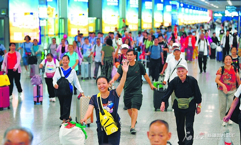 8月7日,旅客走出乌鲁木齐站。今年上半年,新疆铁路发送旅客2370.6万人次,同比增长24.8%。石榴云/新疆日报记者 邹懿摄