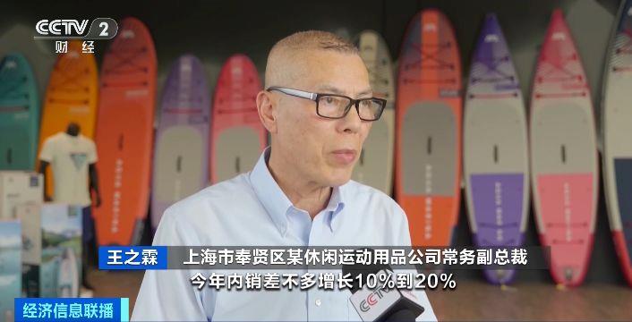 上海市奉贤区某休闲运动用品公司常务副总裁 王之霖:今年内销差不多增长10%到20%。有一些特殊的板,包括儿童、女性、入门的选择比较多,1000多元到3000元。因为桨板是户外运动的延伸,家庭类消费也多了,占比30%。