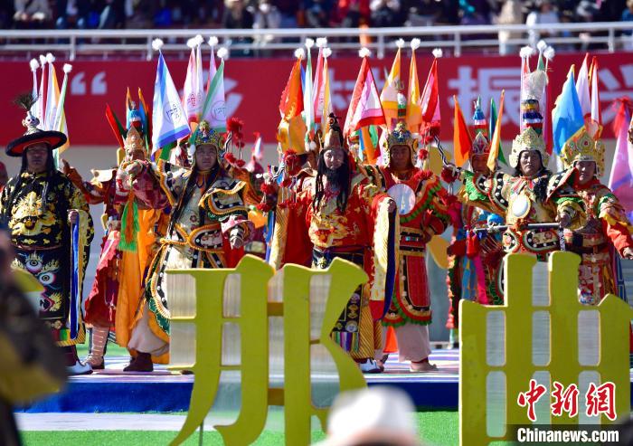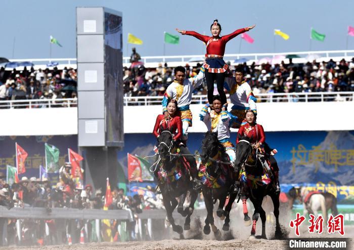 8月10日,2024年那曲恰青赛马节暨第三届“乡村振兴 那曲奋进”活动开幕式在那曲市赛马场举行,精彩的文艺歌舞、马术表演等展示着羌塘草原上的无穷魅力和活力。图为开幕式文艺表演现场。中新社记者 李林 摄