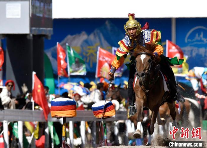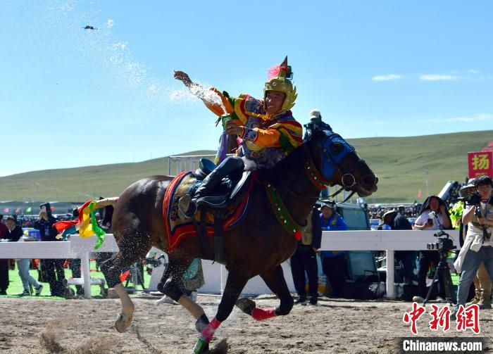 8月10日,2024年那曲恰青赛马节暨第三届“乡村振兴 那曲奋进”活动开幕式在那曲市赛马场举行,精彩的文艺歌舞、马术表演等展示着羌塘草原上的无穷魅力和活力。图为开幕式上的马术表演。中新社记者 李林 摄