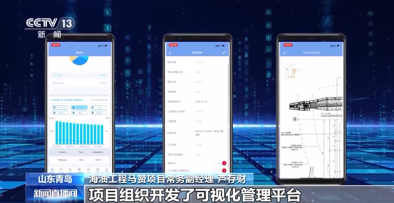 海油工程马赞项目常务副经理 芦存财:对一个总重近2万吨的超级组块,平台材料、设备成千上万,项目组织开发了可视化管理平台,通过数字模拟、建造孪生技术实现建造全流程的数字化管控。