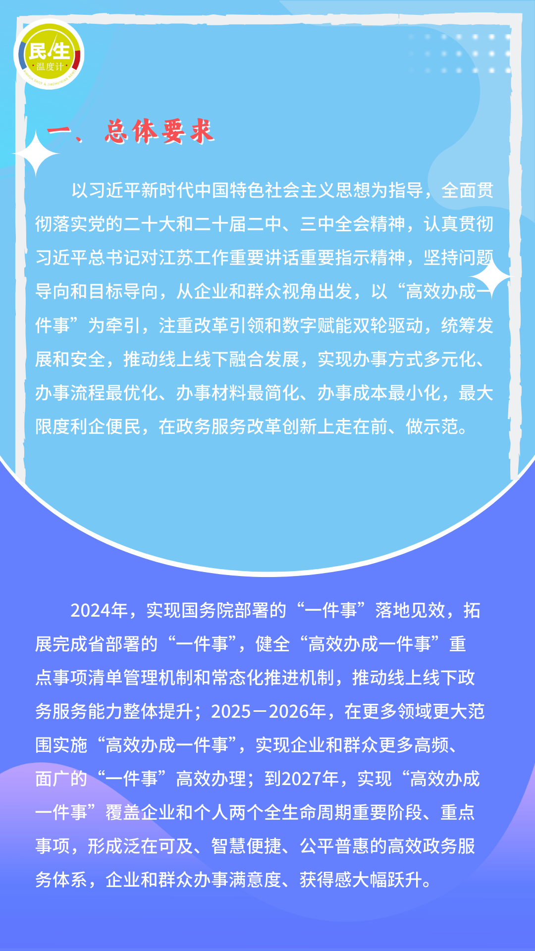 2024年,我省实现国务院部署的“一件事”落地见效,拓展完成省部署的“一件事”,健全“高效办成一件事”重点事项清单管理机制和常态化推进机制,推动线上线下政务服务能力整体提升;2025-2026年,在更多领域更大范围实施“高效办成一件事”,实现企业和群众更多高频、面广的“一件事”高效办理;到2027年,实现“高效办成一件事”覆盖企业和个人两个全生命周期重要阶段、重点事项,形成泛在可及、智慧便捷、公平普惠的高效政务服务体系,企业和群众办事满意度、获得感大幅跃升。
