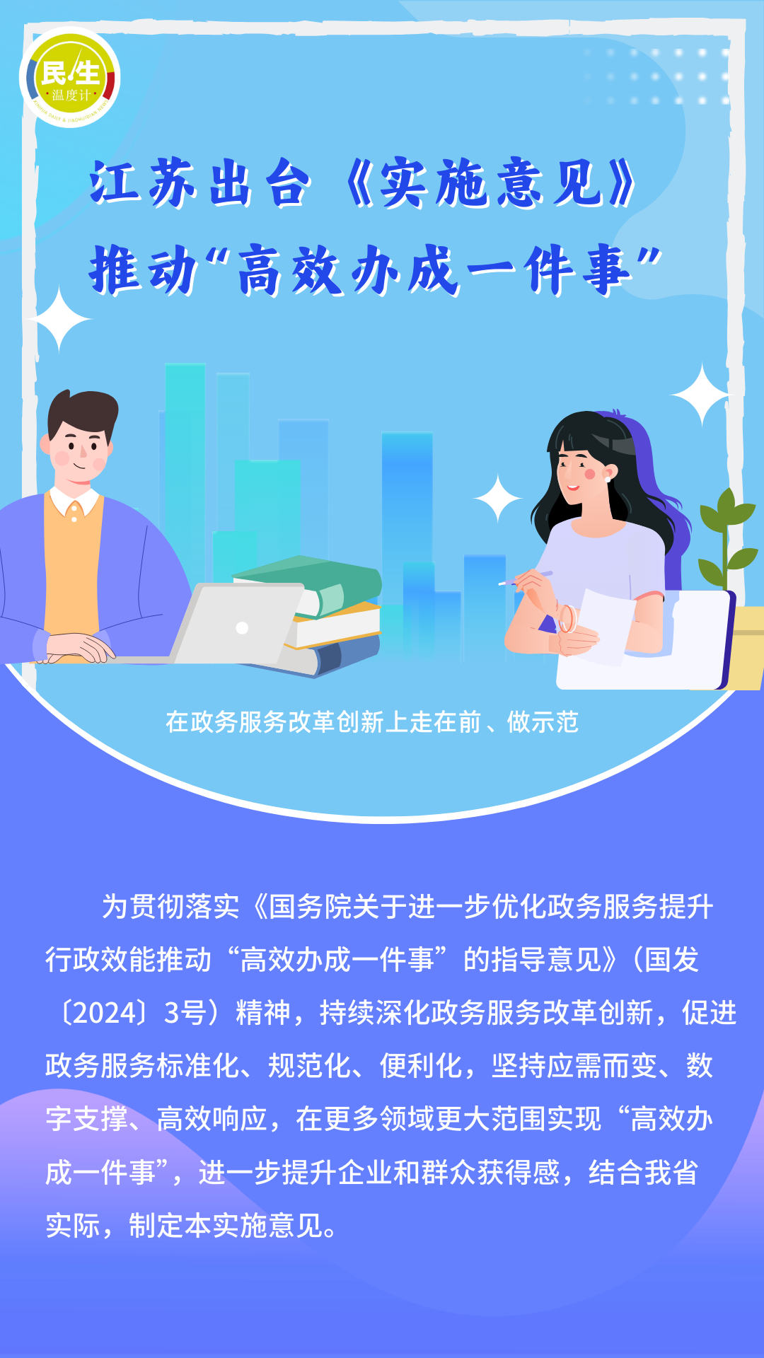 为贯彻落实《国务院关于进一步优化政务服务提升行政效能推动“高效办成一件事”的指导意见》(国发〔2024〕3号)精神,持续深化政务服务改革创新,促进政务服务标准化、规范化、便利化,坚持应需而变、数字支撑、高效响应,在更多领域更大范围实现“高效办成一件事”,进一步提升企业和群众获得感,结合我省实际,制定《省政府进一步优化政务服务提升行政效能推动“高效办成一件事”的实施意见》(以下简称《实施意见》)。经省政府常务会议审议通过,于8月9日正式印发实施。