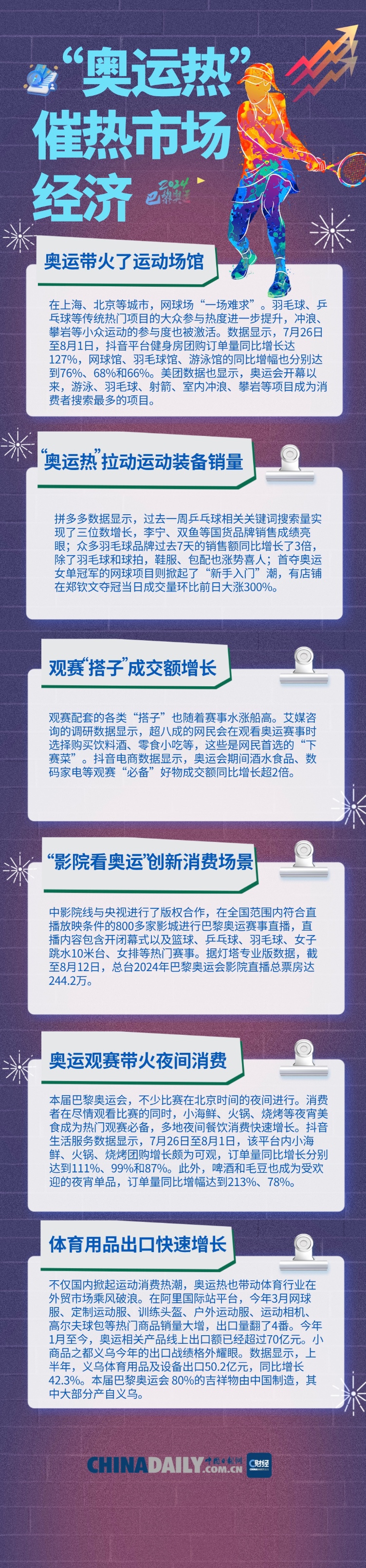 根据多个平台数据统计,健身房、网球馆、羽毛球馆、游泳馆等团购订单量在奥运期间迎来显著增长。同时,奥运冠军们也展现出强大的“带货”能力,运动产品、冠军同款装备等热度飙升。此外,奥运观赛还带动了夜间消费增长以及观赛配套“搭子”的成交额,更带火了“影院看奥运”的创新消费场景。