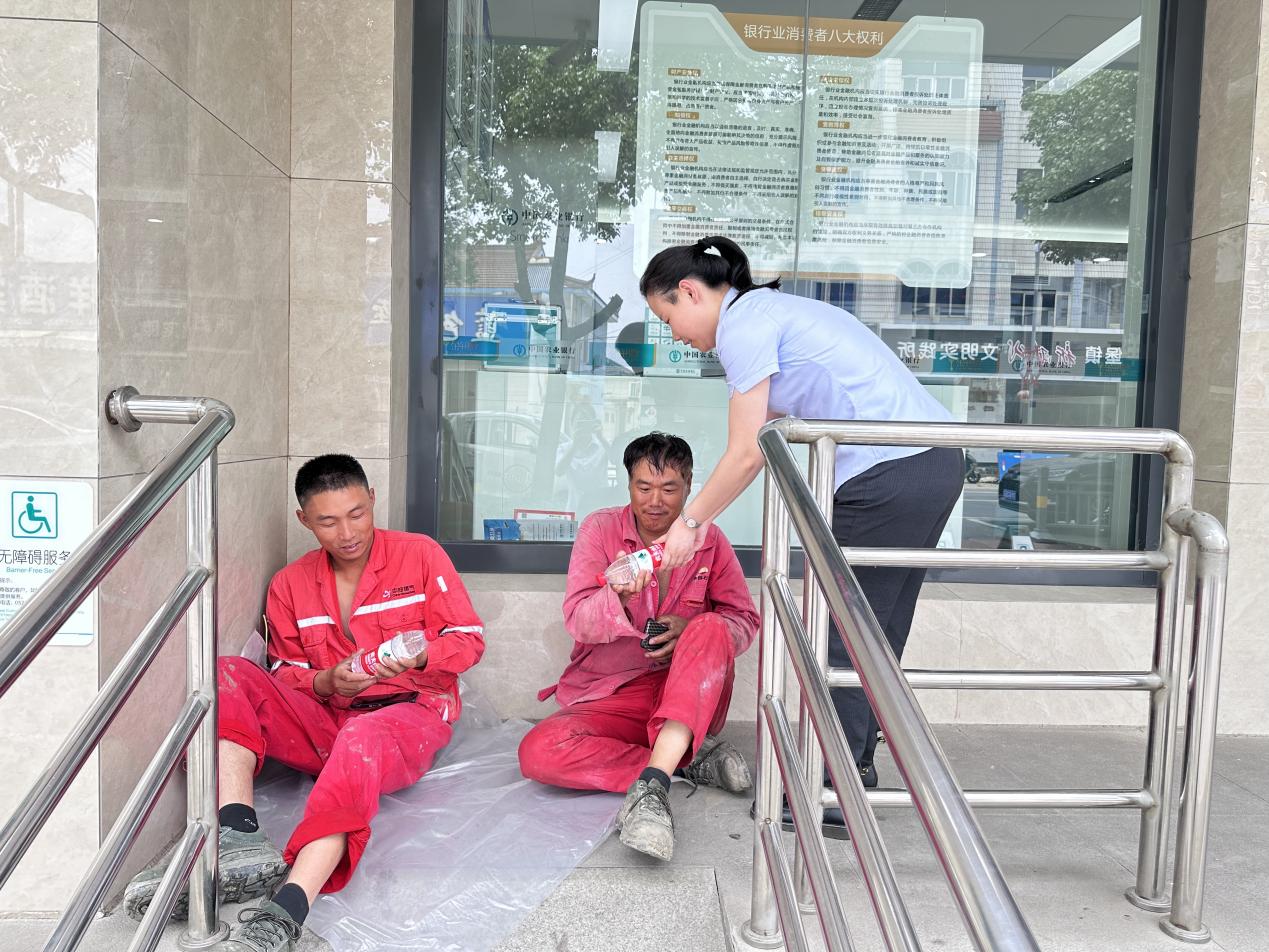 持续的高温天气,考验着每一位坚守一线的户外工作人员。立秋节气当天,农行泰州兴化陈堡支行的内勤行长像往常一样在午饭后回到网点值班,发现两名工人坐在网点门口休息,随即拿来两瓶矿泉水,叮嘱他们“天气炎热,多注意休息”,并告知他们中午可以到银行大堂休息。