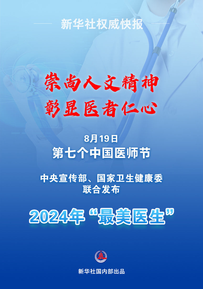 8月19日,第七个中国医师节,主题是“崇尚人文精神,彰显医者仁心”,中央宣传部、国家卫生健康委向全社会公开发布了2024年“最美医生”。