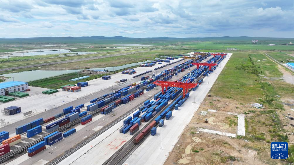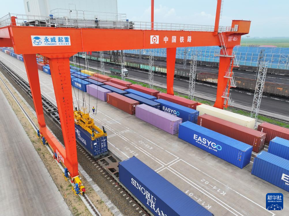 8月7日,在黑龙江绥芬河铁路口岸集装箱换装场,集装箱专用龙门吊对回程中欧班列进行换装(无人机照片)。新华社发(曲艺伟 摄)