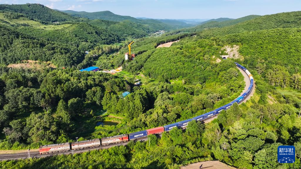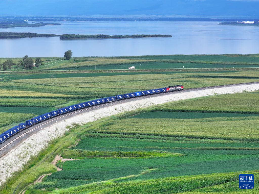 8月9日,一列装载55箱的中欧班列驶出黑龙江同江北站(无人机照片)。新华社发(吴雨南摄)
