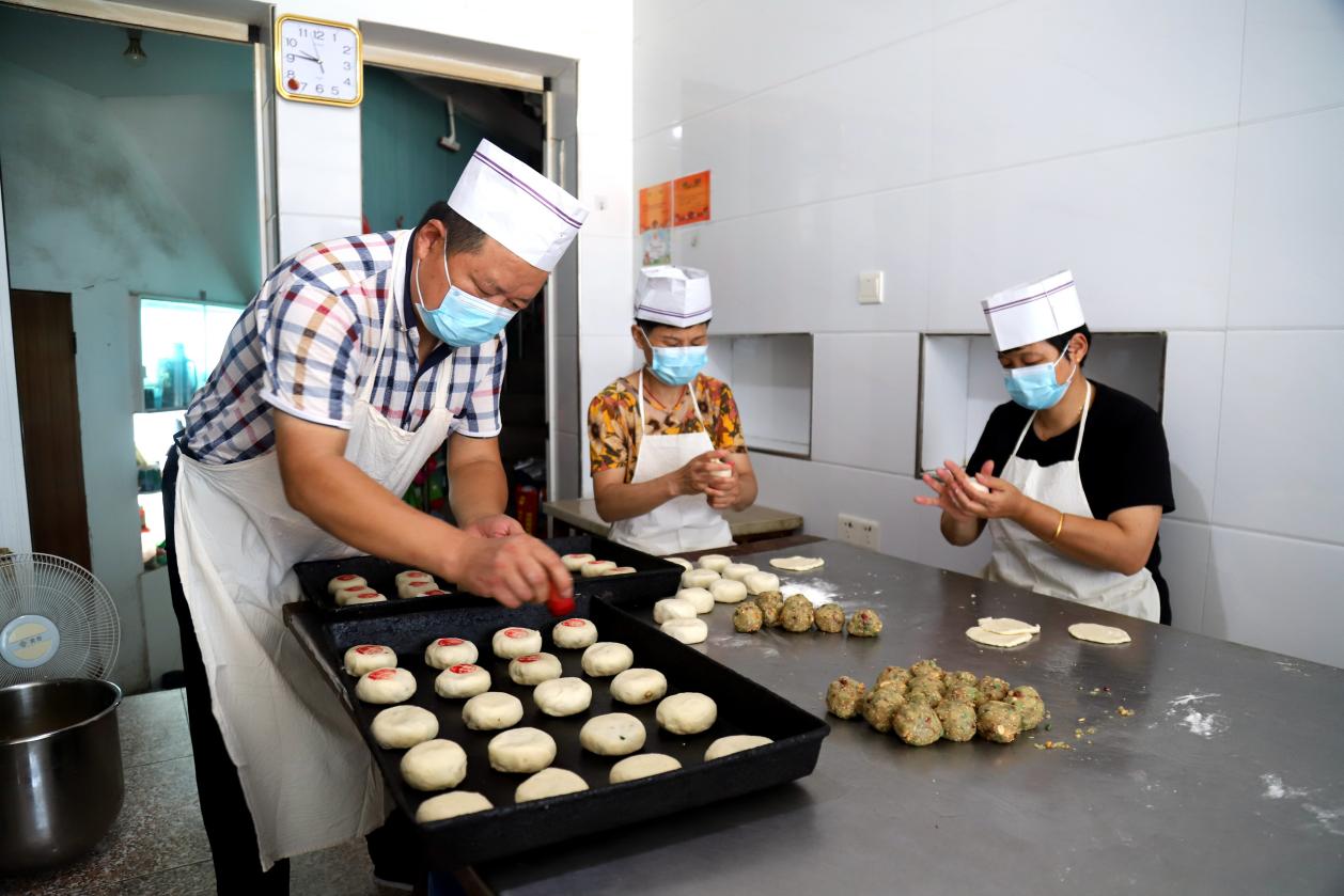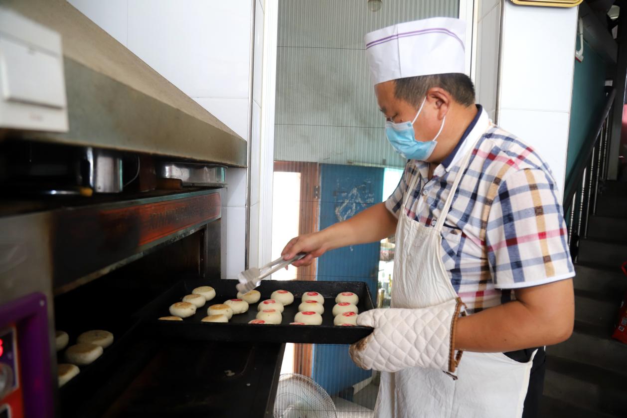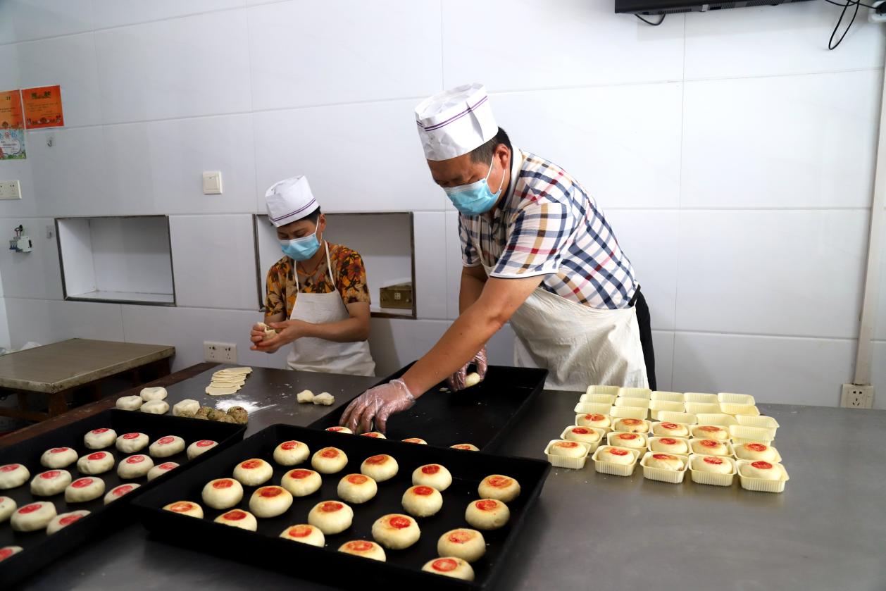 8月22日,在高淳区桠溪街道顾陇集镇炳生月饼生产店内,工人们正在忙碌着手工制作传统苏式月饼准备销往市场。