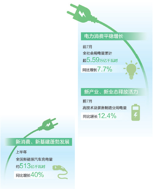 国家能源局最新公布的数据显示,7月高技术及装备制造业用电量同比增长9%,新能源汽车整车制造业用电量同比增长42.8%,批发和零售业、信息传输/软件和信息技术服务业用电量均呈两位数增长。各行业用电量增长情况,折射出经济运行的哪些新动能、新趋势?记者进行了采访。