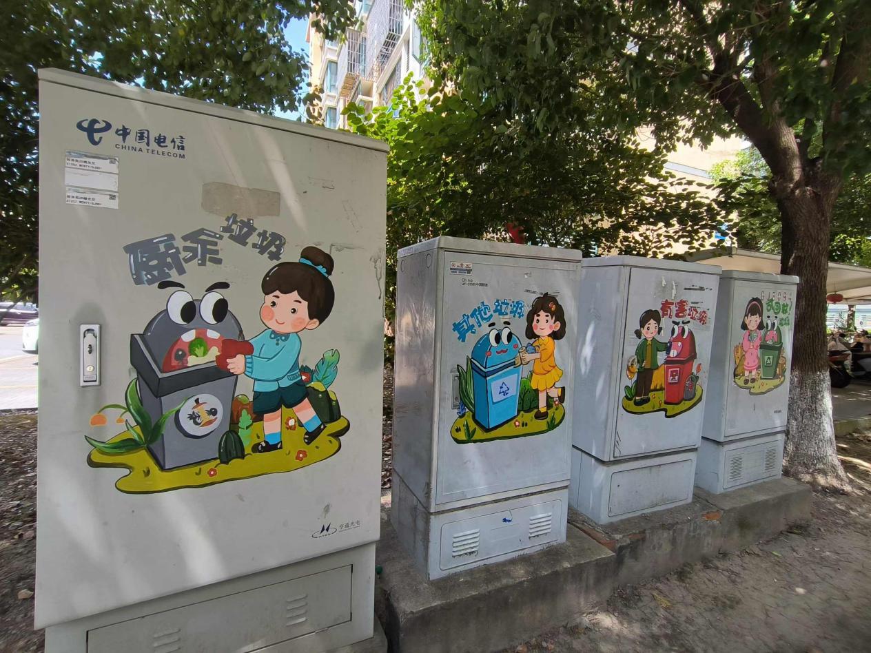 画面上,四类垃圾——厨余垃圾、其他垃圾、有害垃圾和可回收垃圾,通过通俗易懂的简易卡通形象呈现,让小区居民一目了然。这些可爱的卡通角色仿佛在提醒大家:“垃圾分类,从我做起!”每当居民们路过这些彩绘线箱时,都会不自觉地放慢脚步,仔细观察并学习如何正确分类垃圾。