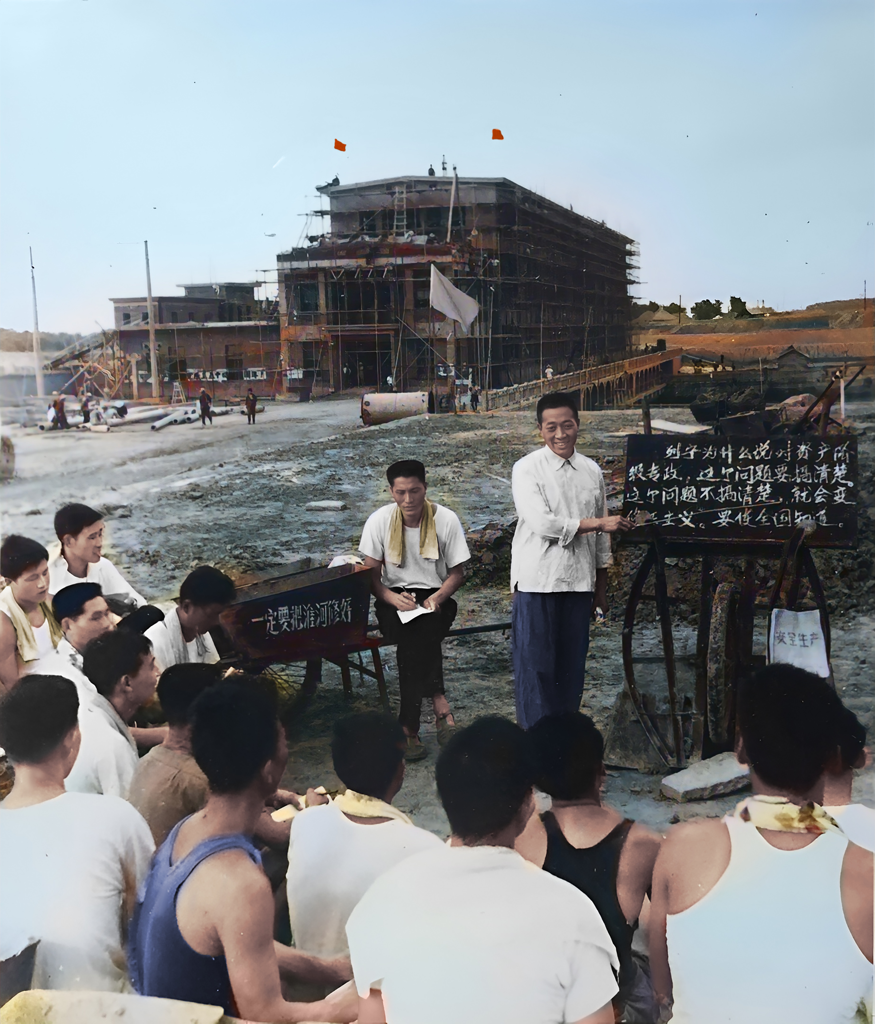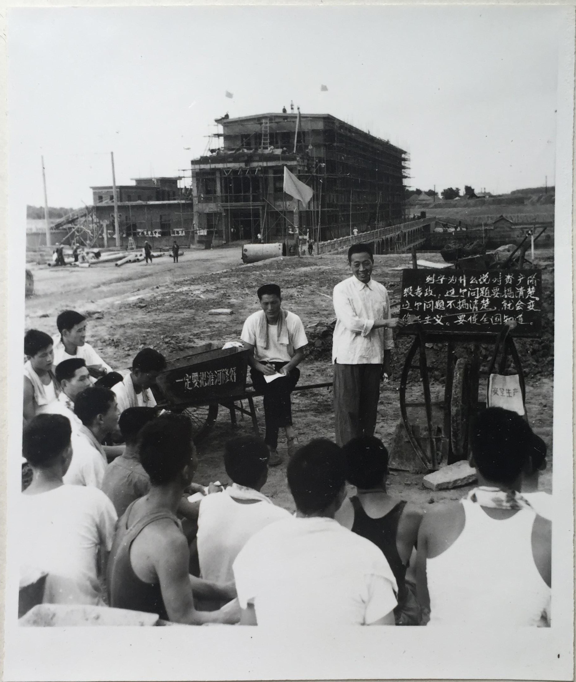 “当年”指的是49年前,也是在盛夏,一群年轻的建设者席地而坐,在同一个地方学习生产安全知识。他们背后,四站的主体结构已经成形。“照片拍摄是1975年6月,那时工程接近尾声了。”陈威回忆道。